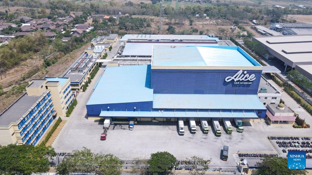 Foto aérea tirada no dia 15 de setembro de 2023 mostra fábrica da Aice em Mojokerto, Java Oriental, Indonésia. Vivendo nos trópicos, o povo indonésio sofre com o clima escaldante. Aice, famosa marca de sorvetes do país, refresca e traz alegria. (Xinhua/XuQin)