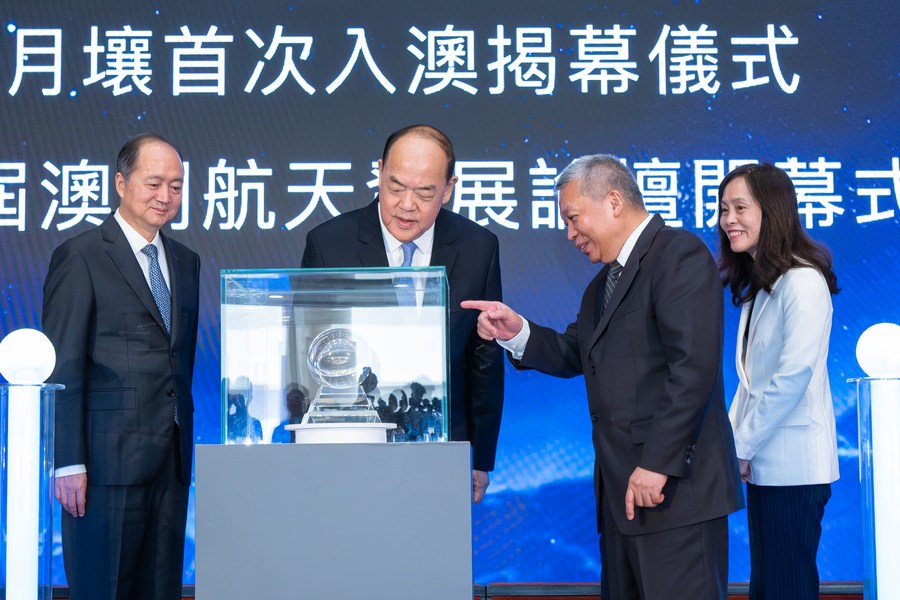 Ho Iat Seng (2º à esquerda), chefe do Executivo da Região Administrativa Especial de Macau, Zheng Xincong (1º à esquerda), diretor do Gabinete de Ligação do Governo Popular Central na RAEM, e Zhang Kejian (2º à direita), chefe da Administração Espacial Nacional da China, observam amostra de solo lunar em exposição sobre as realizações da China na exploração e navegação espaciais aberta em Macau em 28 de novembro de 2023. (Xinhua/Cheong Kam Ka)