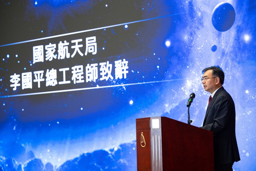 Li Guoping, engenheiro-chefe da Administração Espacial Nacional da China, discursa na cerimônia realizada na Região Administrativa Especial de Macau, sul da China. (Xinhua/Cheong Kam Ka)