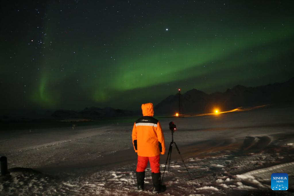 Li Bin, pesquisador adjunto do Instituto de Pesquisa Polar da China, tira fotos de auroras perto da Estação Yellow River em Ny-Alesund, Svalbard, Noruega, em 13 de novembro de 2023. (Xinhua/Zhang Yuliang)