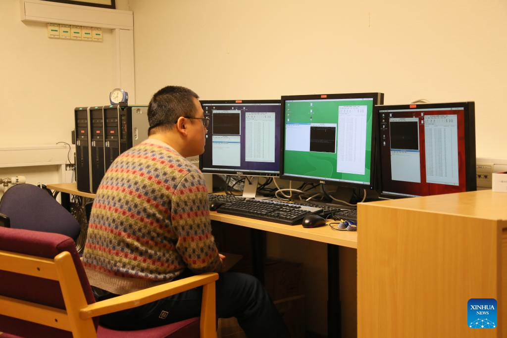 Li Bin, pesquisador adjunto do Instituto de Pesquisa Polar da China, trabalha em seu escritório na Estação do Rio Amarelo em Ny-Alesund, Svalbard, Noruega, em 10 de novembro de 2023. (Xinhua/Zhang Yuliang)