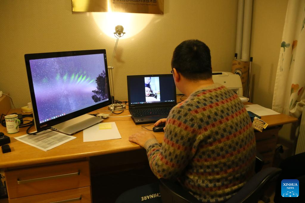 Li Bin, pesquisador adjunto do Instituto de Pesquisa Polar da China, conversa por vídeo com sua esposa e filho na Estação do Rio Amarelo em Ny-Alesund, Svalbard, Noruega, em 12 de novembro de 2023. (Xinhua/Zhang Yuliang)