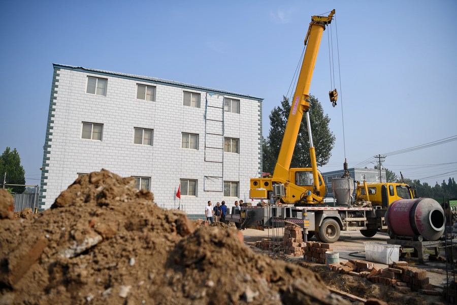 Operários reconstróem um prédio danificado na aldeia de Diaowo, cidade de Zhuozhou, Província de Hebei, no norte da China, em 26 de setembro de 2023. (Xinhua/Mu Yu)