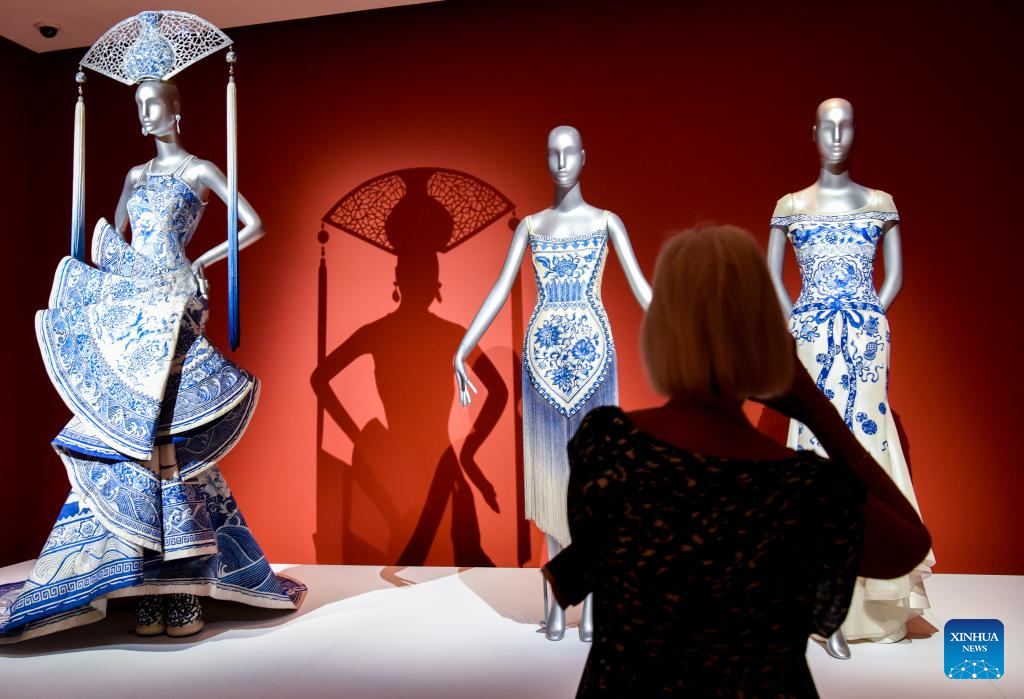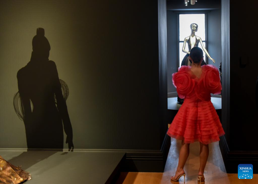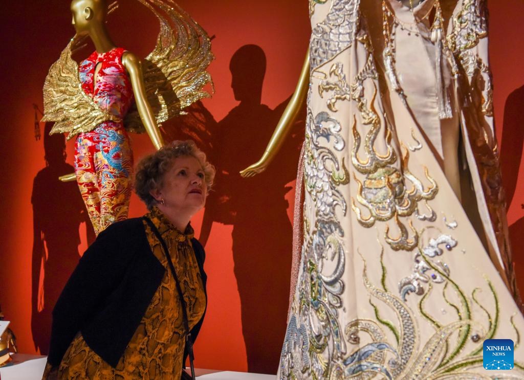 Pessoa observa criações da costureira chinesa Guo Pei em Auckland, Nova Zelândia, no dia 8 de dezembro de 2023. A exposição “Moda, Arte, Fantasia” de sábado trará mais de 60 peças marcantes da carreira de duas décadas de Guo Pei, convidando neozelandeses para conhecer a grandeza de sua alta costura artística. (Xinhua/Guo Lei)