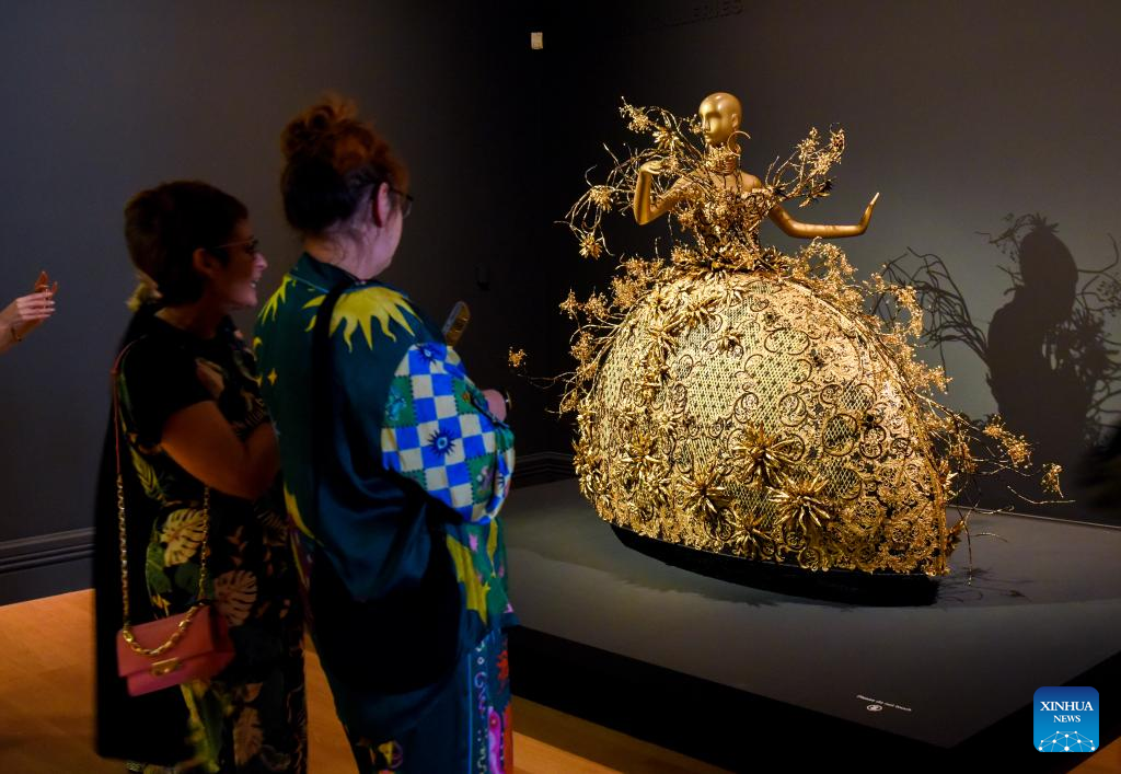 Visitantes observam criação da costureira chinesa Guo Pei em Auckland, Nova Zelândia, no dia 8 de dezembro de 2023. A exposição “Moda, Arte, Fantasia” de sábado trará mais de 60 peças marcantes da carreira de duas décadas de Guo Pei, convidando neozelandeses para conhecer a grandeza de sua alta costura artística. (Xinhua/Guo Lei)