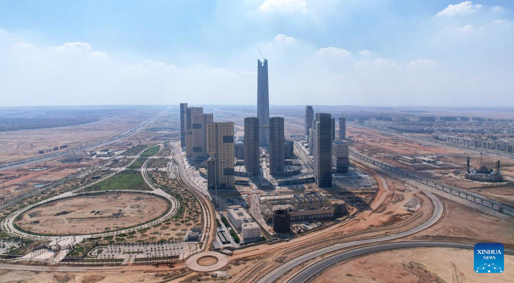Foto aérea tirada no dia 28 de junho de 2023 mostra Distrito Comercial Central (DCC) da nova capital administrativa do Egito, à 45 quilômetros a leste do Cairo, Egito. No amplo e escaldante deserto do Norte da África, trabalhadores chineses e egípcios trabalham contra o tempo para instalar em alguns arranha-céus recém-construídos fachadas de vidro fabricadas na China.