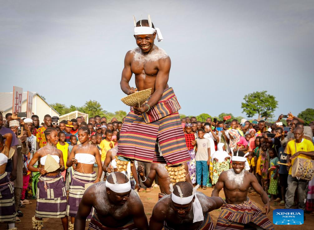 Foto tirada em 25 de maio de 2024 mostra dançarinos se apresentando após a final da primeira edição da "Superliga da Aldeia" africana em Parakou, Benin. (Xinhua/Li Yahui)