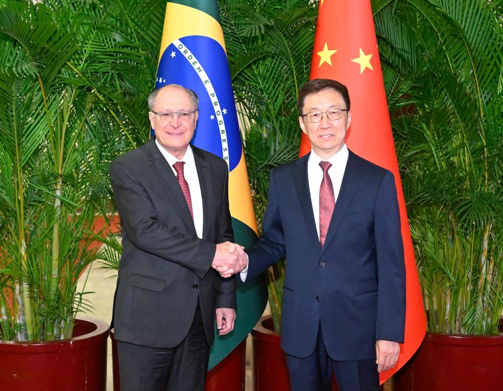Beijing, 6 jun (Xinhua) -- O vice-presidente chinês, Han Zheng, conversou na quinta-feira com o vice-presidente da República Federativa do Brasil, Geraldo Alckmin, e eles copresidiram a sétima reunião da Comissão Sino-Brasileira de Alto Nível de Concertação e Cooperação (COSBAN), em Beijing.