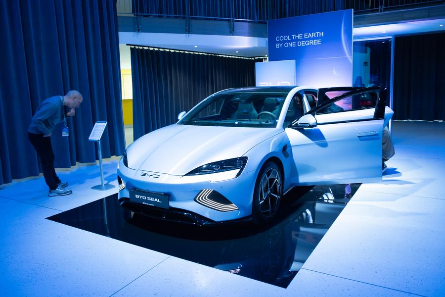 Homem observa um veículo elétrico da BYD em Budapeste, Hungria, em 17 de outubro de 2023. (Foto por Attila Volgyi/Xinhua)