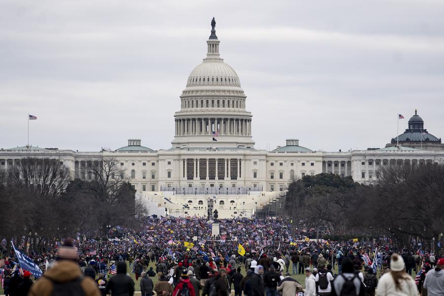 Foto de arquivo tirada no dia 6 de janeiro de 2021 mostra apoiadores do ex-presidente dos EUA, Donald Trump, reunidos em frente ao edifício do Capitólio em Washington, D.C., Estados Unidos. (Xinhua/Liu Jie)