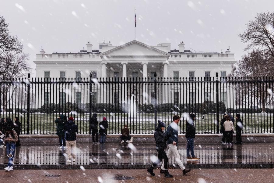 Casa Branca durante nevasca em Washington, D.C., Estados Unidos, no dia 15 de janeiro de 2023. (Foto por Aaron Schwartz/Xinhua)