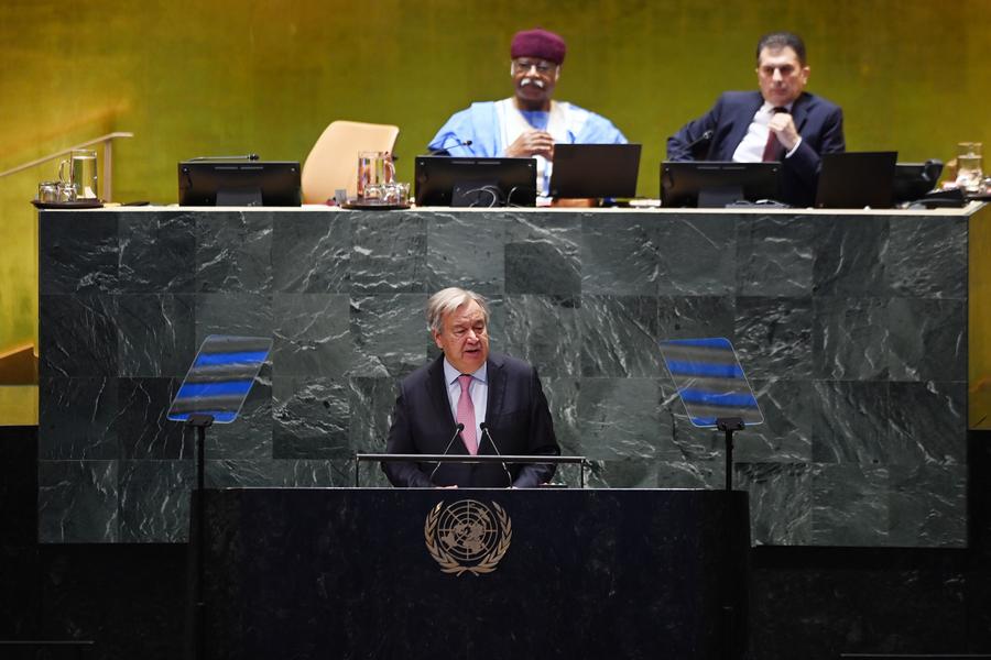 Secretário-Geral da ONU, António Guterres (frente), discursa na Cúpula do Futuro na sede da ONU em Nova York, no dia 22 de setembro de 2024. (Xinhua/Li Rui)
