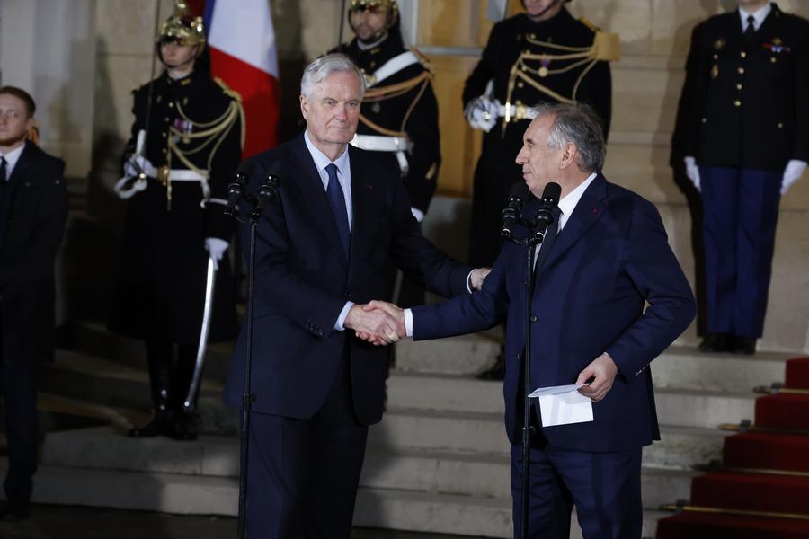 Francois Bayrou (direita, à frente) cumprimenta primeiro-ministro francês cessante, Michel Barnier, (esquerda, à frente) na cerimônia de transferência de poder em Paris, França, no dia 13 de dezembro de 2024. (Foto por Henri Szwarc/Xinhua)