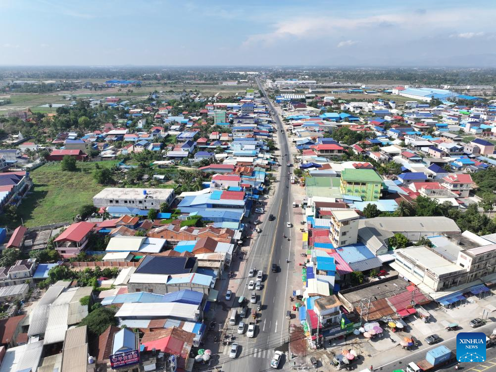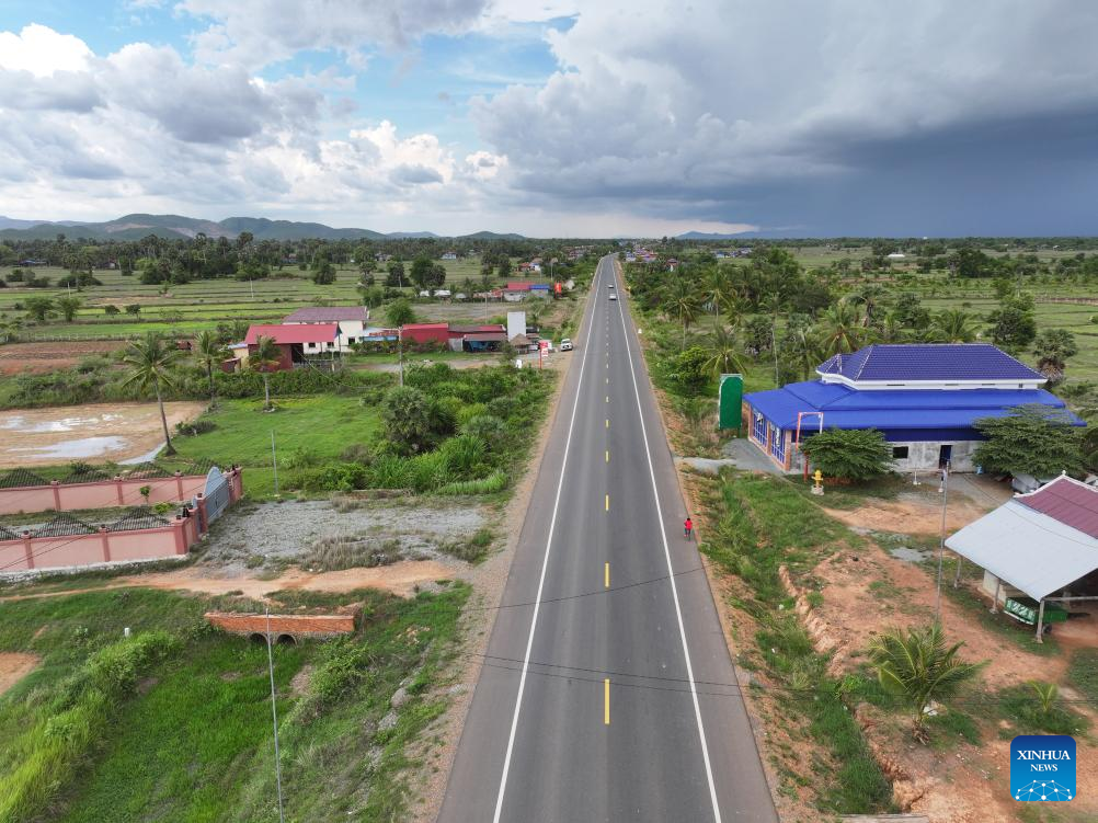 Foto aérea de drone tirada no dia 21 de abril de 2025 mostra Estrada Nacional 41, financiada pela China, na província de Kandal, Camboja. (Foto por Nitola/Xinhua)