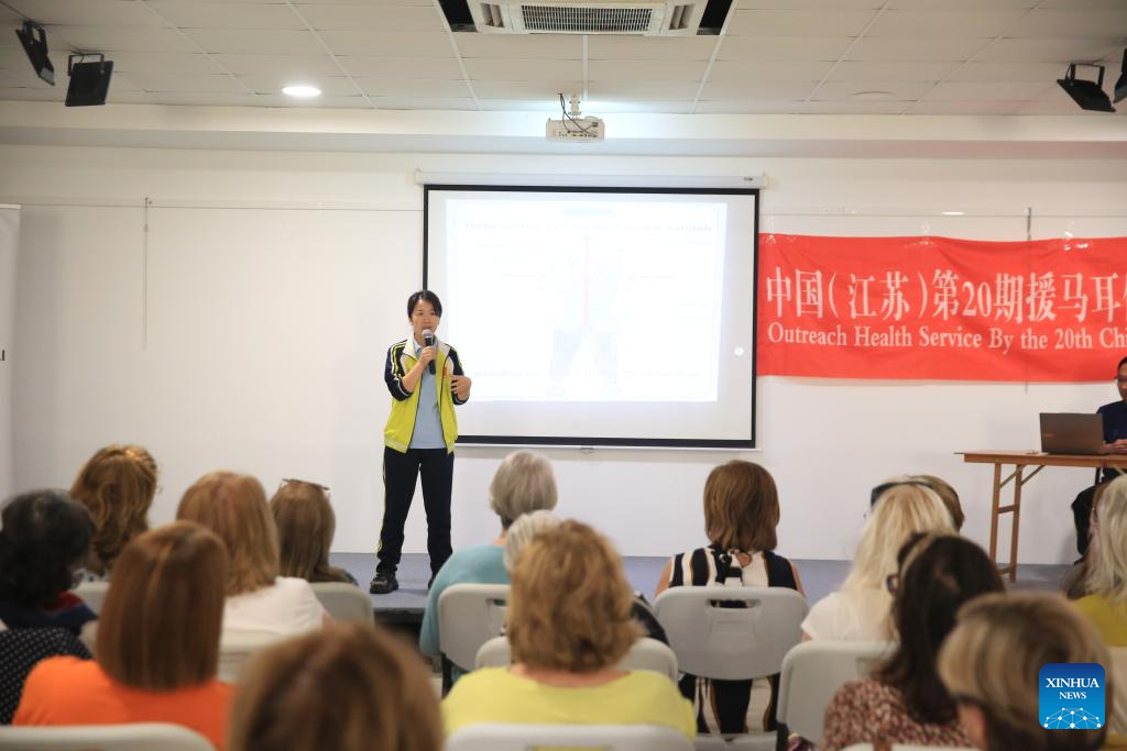 Tang Limei, membro da 20ª equipe médica chinesa de Malta, dá uma palestra sobre o Baduanjin, uma forma tradicional de exercício aeróbico chinês conhecido por seus benefícios à saúde, em Swieqi, Malta, em 6 de maio de 2025. A 20ª equipe médica chinesa do Centro Regional Mediterrâneo de Medicina Tradicional Chinesa (MRCTCM, na sigla em inglês) prestou serviços clínicos gratuitos aos residentes no Conselho Local de Swieqi, no leste de Malta, na terça-feira. O evento começou com uma palestra de Tang Limei, um membro da equipe médica, que apresentou o Baduanjin, uma forma tradicional de exercício aeróbico chinês conhecido por seus benefícios à saúde. Após a demonstração de Tang, os participantes participaram com entusiasmo da prática. Após a palestra, a equipe médica ofereceu uma série de serviços, incluindo verificações de pressão arterial e açúcar no sangue, consultas de saúde personalizadas e a distribuição de suprimentos médicos gratuitos. (Xinhua/Chen Wenxian)