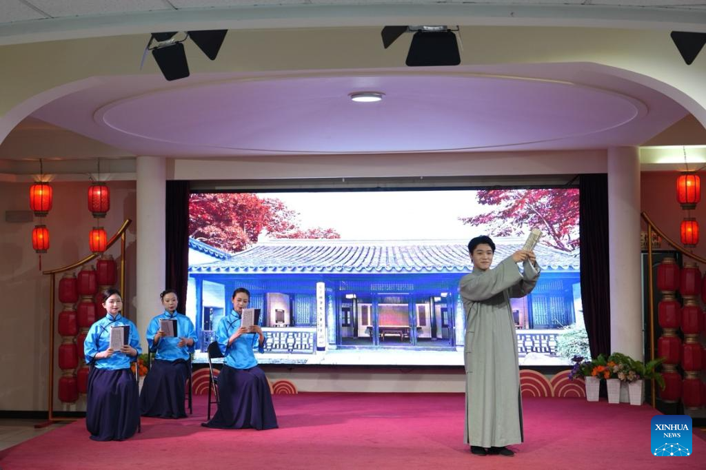 Artistas de um grupo de Pingtan da Província de Jiangsu, no leste da China, se apresentam no Centro Cultural da China em Abuja, Nigéria, em 11 de maio de 2025. Dezenas de nigerianos em Abuja ficaram encantados no domingo, enquanto um grupo visitante de artistas do sul da China os entretinha e os apresentava ao Pingtan, uma cativante forma de arte tradicional chinesa que combina magistralmente a narrativa com instrumentos musicais, utilizando adereços simples para aprimorar a apresentação. (Xinhua/Yang Zhe)