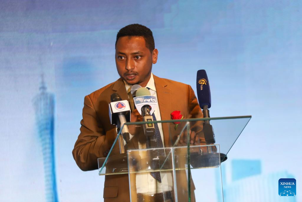 Zeleke Temesgen, comissário da Comissão de Investimentos da Etiópia, fala em um evento de lançamento da marca organizado pela montadora chinesa Guangzhou Automobile Group Co., Ltd (GAC Group) em Adis Abeba, capital da Etiópia, em 17 de maio de 2025. A montadora chinesa Guangzhou Automobile Group Co., Ltd (GAC Group) apresentou dois de seus modelos de veículos elétricos (EV) ao mercado etíope, marcando a entrada da marca chinesa no país da África Oriental. (Xinhua/Michael Tewelde)