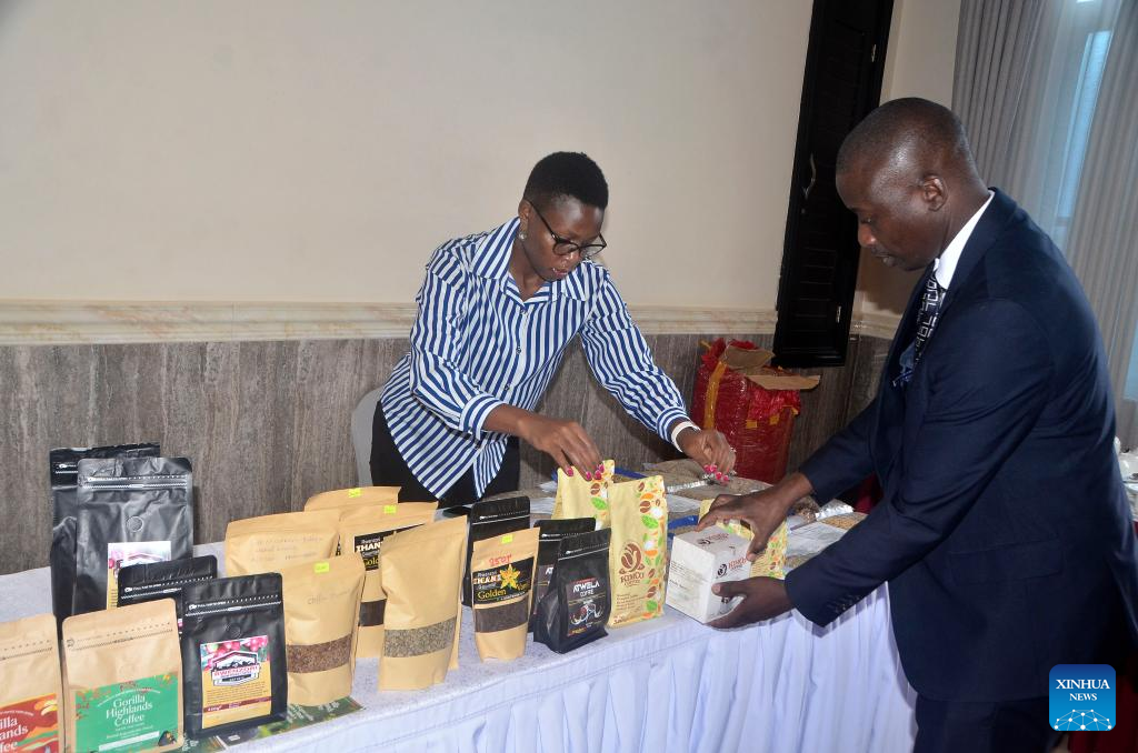 Visitantes conhecem produto de café na Conferência sobre Comércio e Investimento em Café entre Uganda e China, em Campala, Uganda, no dia 20 de maio de 2025. Uma delegação de investidores chineses está visitando Uganda para estabelecer laços comerciais com cafeicultores locais, conforme a demanda pela cultura comercial aumenta no mercado chinês em rápida expansão. (Foto por Nicholas Kajoba/Xinhua)