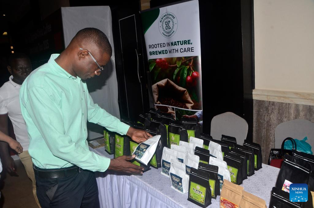 Visitante olha produto de café na Conferência sobre Comércio e Investimento em Café entre Uganda e China, em Campala, Uganda, no dia 20 de maio de 2025. Uma delegação de investidores chineses está visitando Uganda para estabelecer laços comerciais com cafeicultores locais, conforme a demanda pela cultura comercial aumenta no mercado chinês em rápida expansão. (Foto por Nicholas Kajoba/Xinhua)