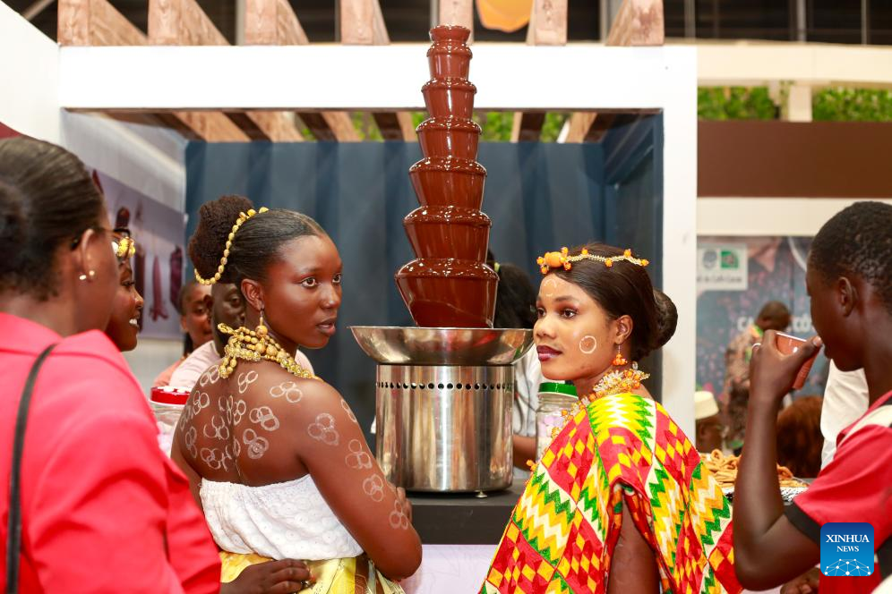 Visitantes fazem fila para provar chocolate feito com cacau da Costa do Marfim na 7ª edição da Exposição Internacional de Agricultura e Recursos Animais de Abidjan, em Abidjan, Costa do Marfim, no dia 23 de maio de 2025. (Foto por Laurent Idibouo/Xinhua)