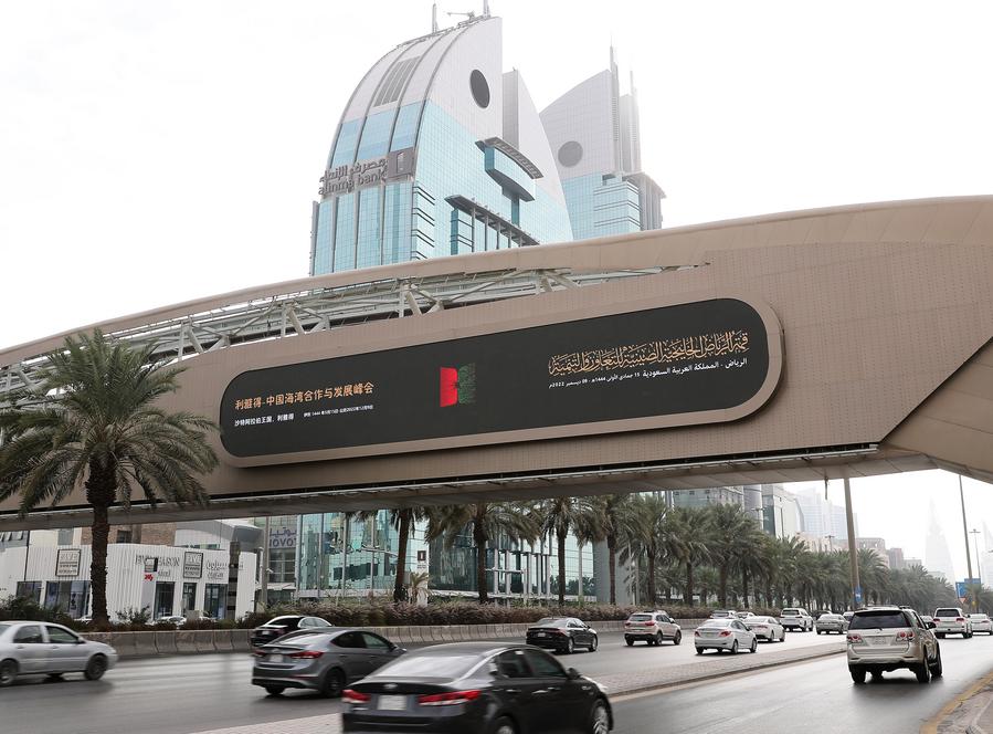 Foto mostra telão sobre cúpula China-Conselho de Cooperação do Golfo em uma rua de Riad, Arábia Saudita, no dia 7 de dezembro de 2022. (Xinhua/Wang Dongzhen)