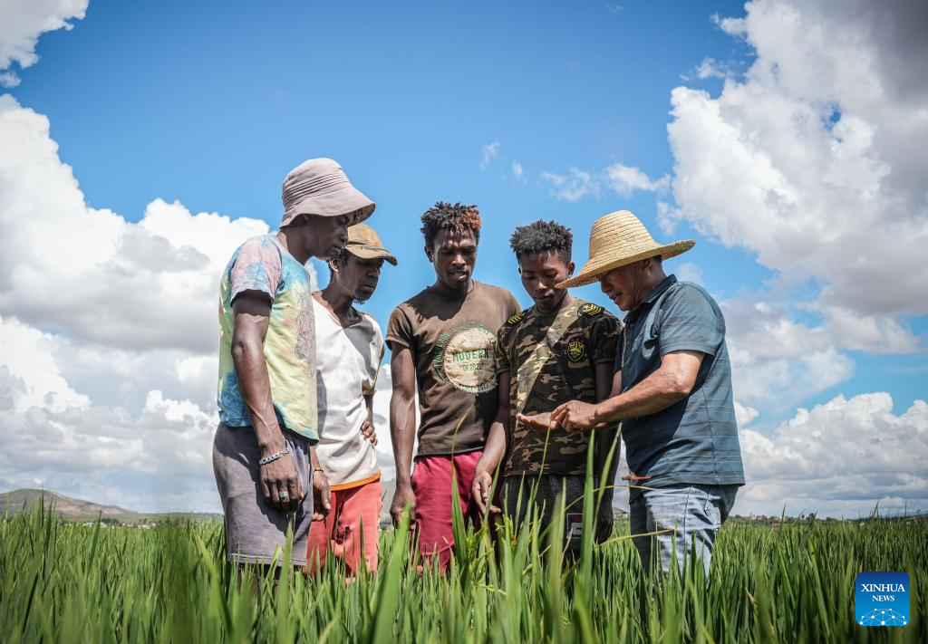 Especialistas agrícolas chineses observam crescimento do arroz híbrido em Mahitsy, Madagascar, no dia 25 de março de 2025. (Xinhua/Li Yahui)
