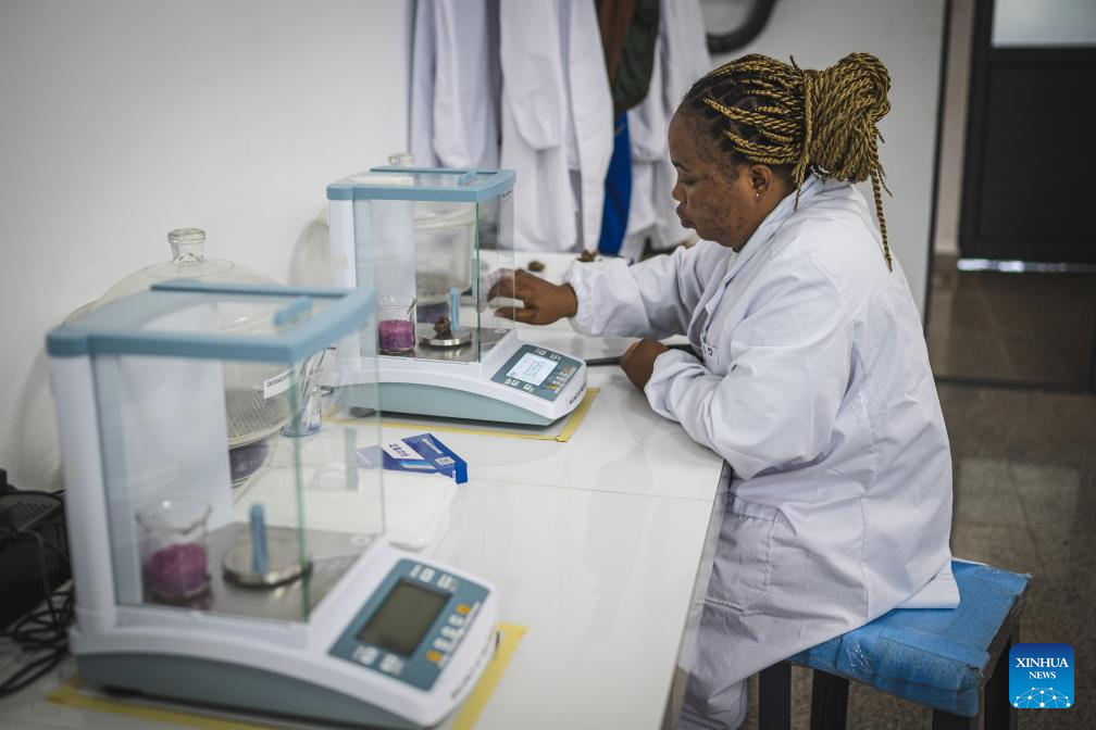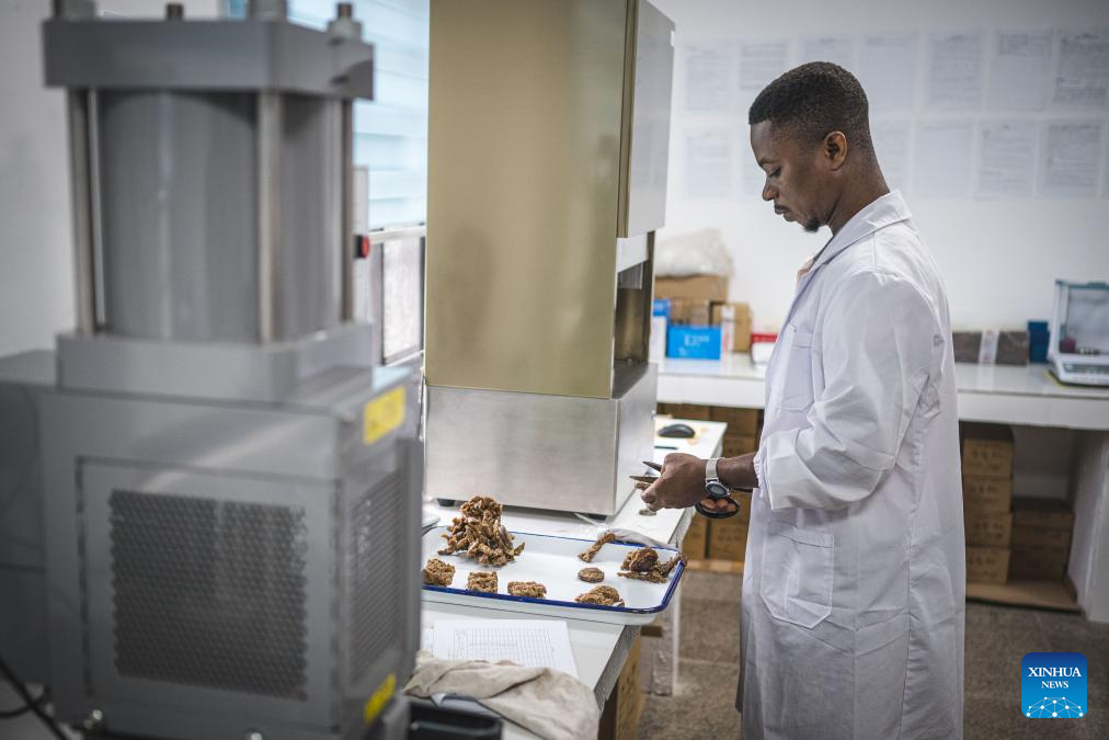Técnico testa amostra de borracha na fábrica de processamento de borracha de uma empresa chinesa em Grand-Bereby, Costa do Marfim, no dia 30 de maio de 2025. (Xinhua/Wang Guansen)