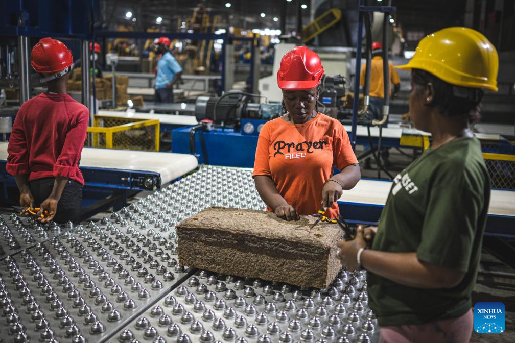 Trabalhadores processam blocos de borracha na fábrica de processamento de borracha de uma empresa chinesa em Grand-Bereby, Costa do Marfim, no dia 29 de maio de 2025. (Xinhua/Wang Guansen)