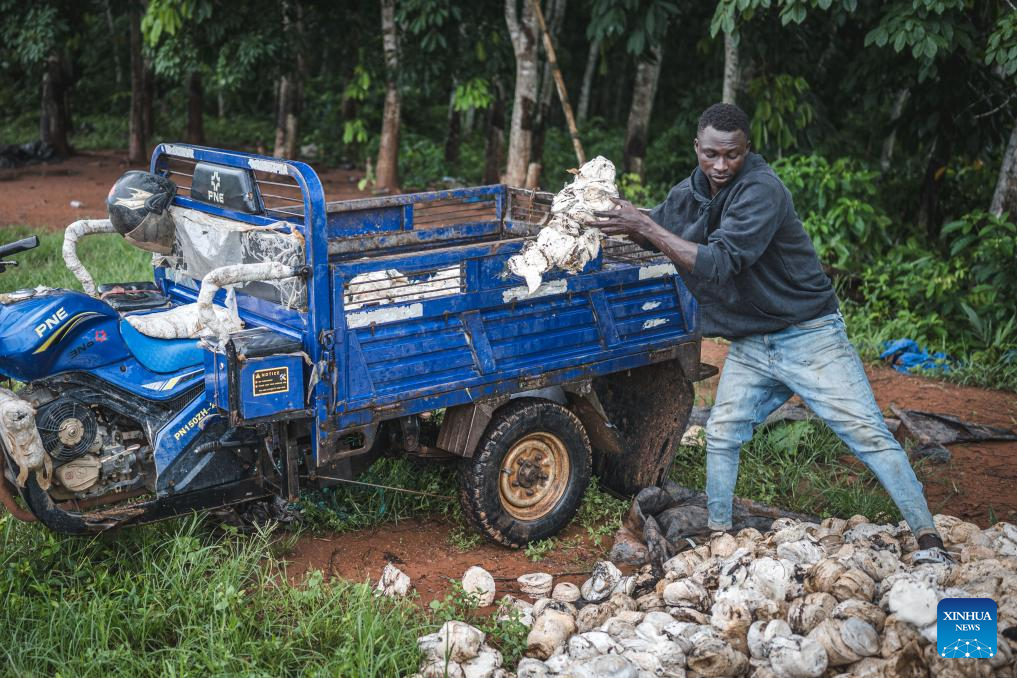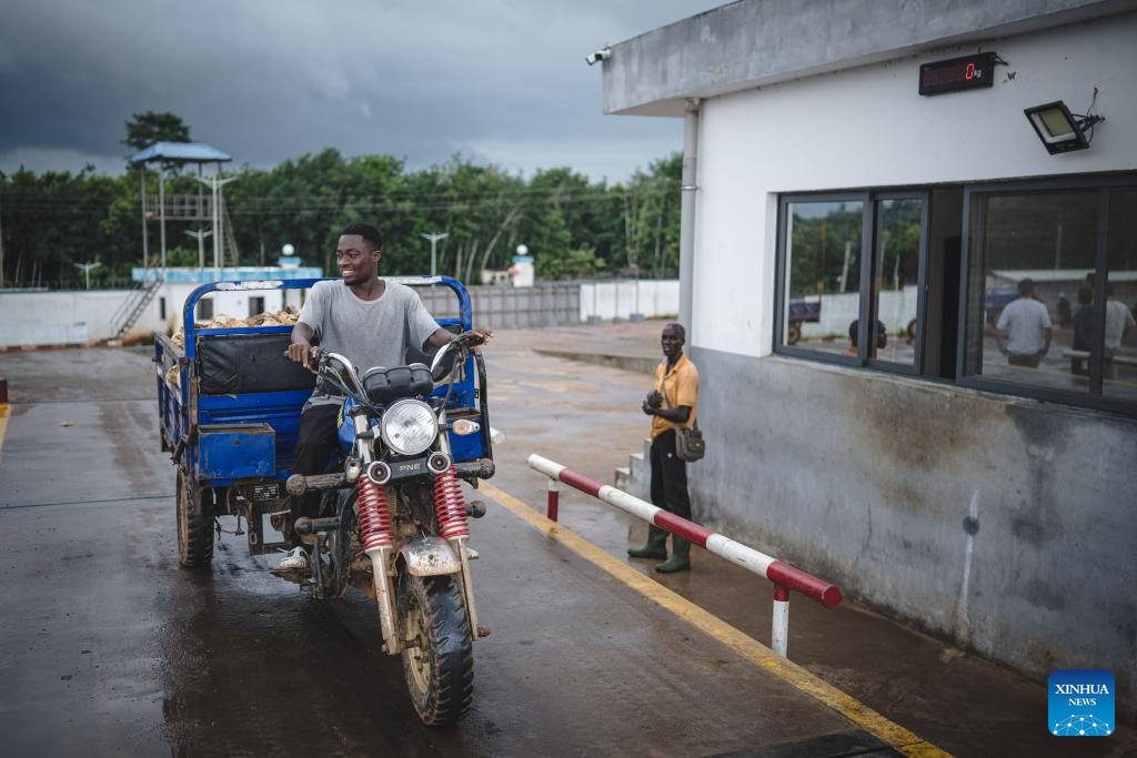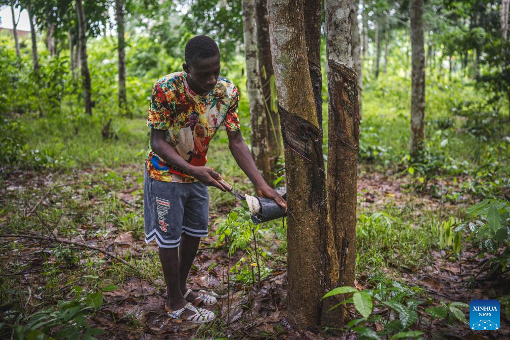Abidjan, 14 jun (Xinhua) -- Ao amanhecer em Grand-Bereby, uma cidade no departamento de San Pedro, no sudoeste da Costa do Marfim, carroças de três rodas carregadas com látex branco leitoso serpenteiam por exuberantes plantações de borracha, rumo a uma fábrica novinha em folha construída por uma empresa chinesa.