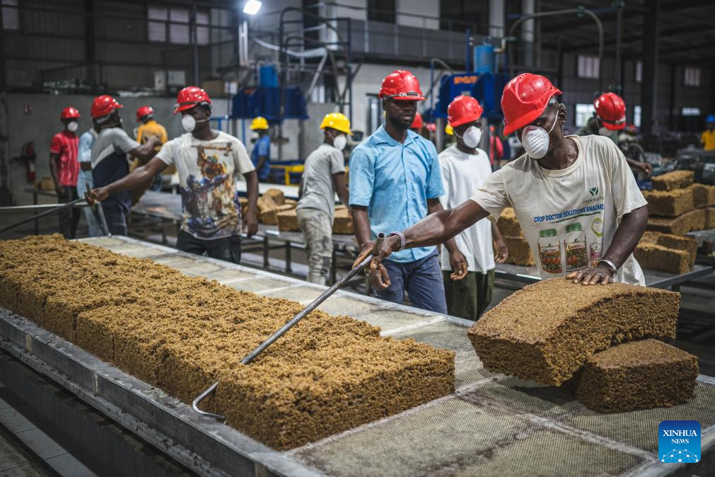 Trabalhadores organizam blocos de borracha na fábrica de processamento de borracha de uma empresa chinesa em Grand-Bereby, Costa do Marfim, no dia 29 de maio de 2025. (Xinhua/Wang Guansen)