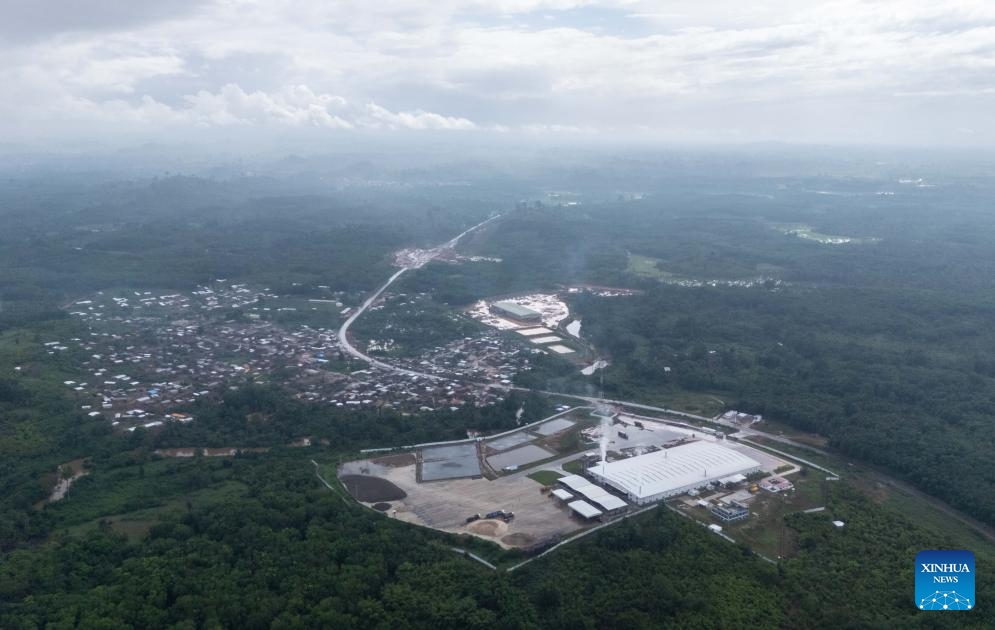 Foto aérea tirada em 30 de maio de 2025 mostra fábrica de processamento de borracha de uma empresa chinesa em Grand-Bereby, Costa do Marfim. (Xinhua/Wang Guansen)