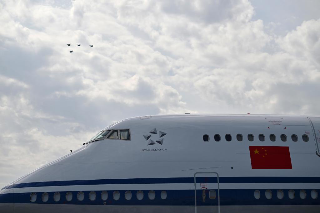 Os caças da Força Aérea do Cazaquistão escoltaram o avião de Xi após a decolagem.