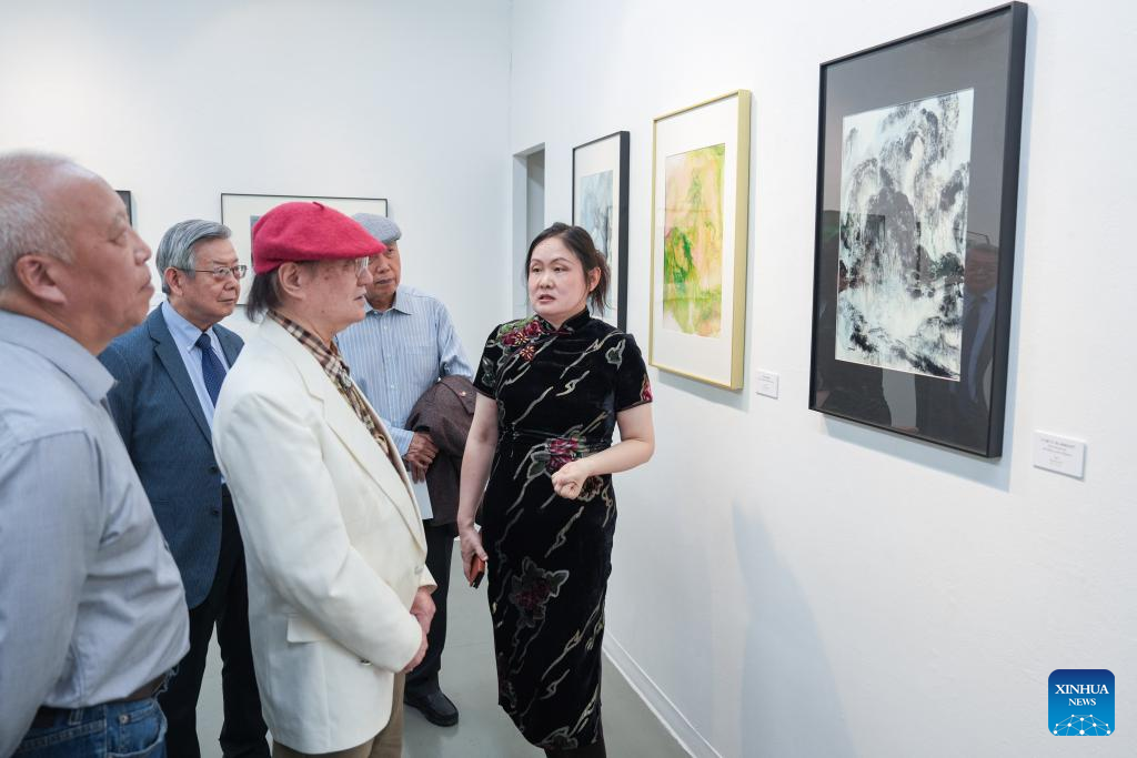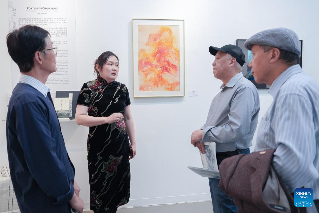 Artista chinesa Li Chunyang (1ª d) conversa com artistas de Nova York na cerimônia de abertura de sua exposição intitulada "Poética de Chunyang: Transgressão e Invocação de uma Tradição", na Galeria 456, em Nova York, Estados Unidos, em 13 de junho de 2025. (Foto por Zack Zhang/Xinhua)