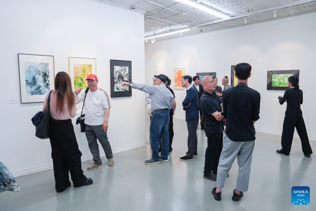 Convidados conversam em meio às obras da artista chinesa Li Chunyang durante a noite de abertura de sua exposição intitulada "Poética de Chunyang: Transgressão e Invocação de uma Tradição" na Galeria 456 em Nova York, Estados Unidos, em 13 de junho de 2025. (Foto por Zack Zhang/Xinhua)