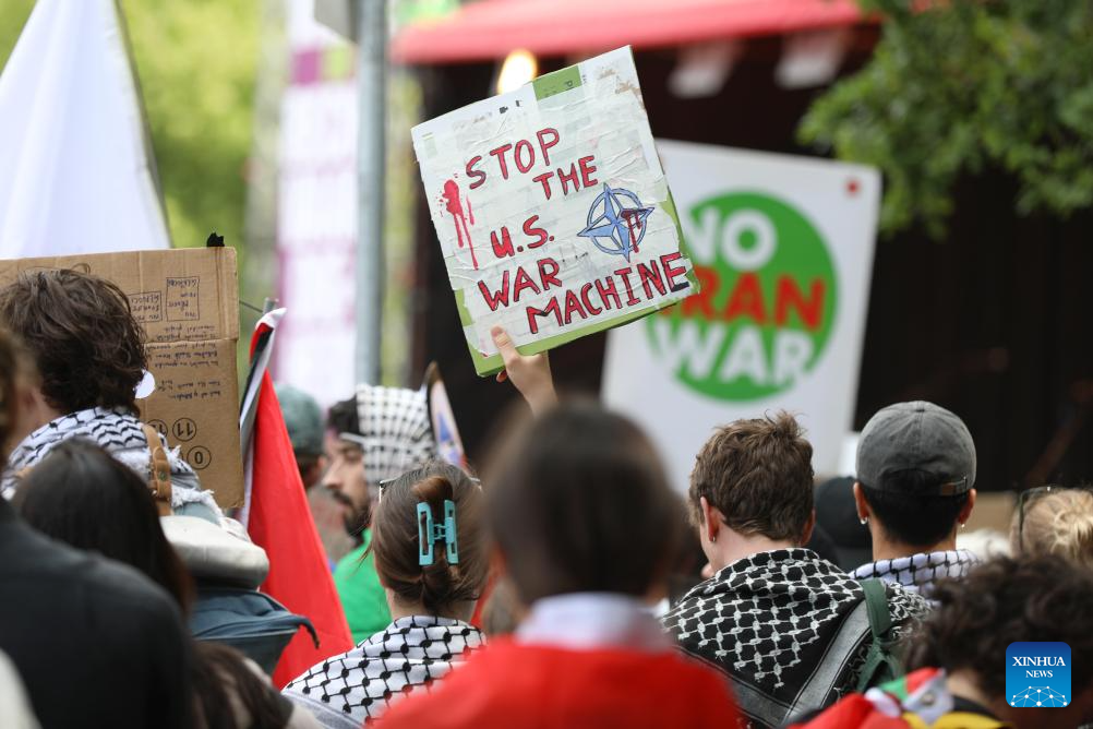 Manifestantes segurando faixas e cartazes são fotografados em Haia, Holanda, em 22 de junho de 2025. O protesto, que contou com a participação de centenas de pessoas, ocorreu dois dias antes da reunião de cúpula da OTAN, na qual se espera que os Estados-membros pressionem por maiores gastos com defesa. Embora a manifestação tenha sido anunciada como uma oposição à OTAN e à guerra em Gaza, ela também atraiu participantes com faixas que diziam "Não à Guerra do Irã", após os ataques aéreos dos EUA a três instalações nucleares iranianas no dia anterior. (Xinhua/Zhao Dingzhe)