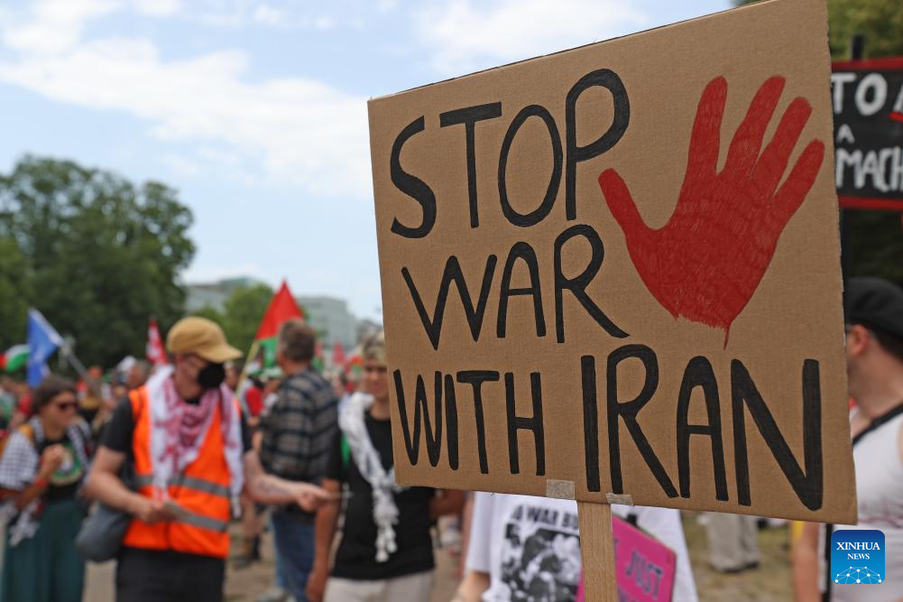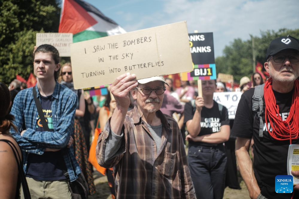 Manifestantes segurando faixas e cartazes são fotografados em Haia, Holanda, em 22 de junho de 2025. (Xinhua/Zhao Dingzhe)
