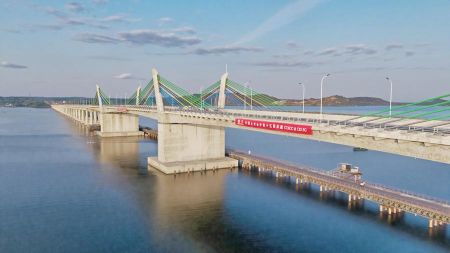 Foto aérea tirada com drone em 19 de junho de 2025 mostra a Ponte Magufuli, construída pela China, em Mwanza, Tanzânia. (China Civil Engineering Construction Corporation/Divulgação via Xinhua)