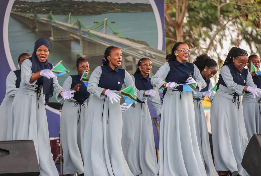 Dançarinas se apresentam durante uma cerimônia de inauguração da Ponte Magufuli, construída pela China, em Mwanza, Tanzânia, em 19 de junho de 2025. (Xinhua/Emmanuel Herman)