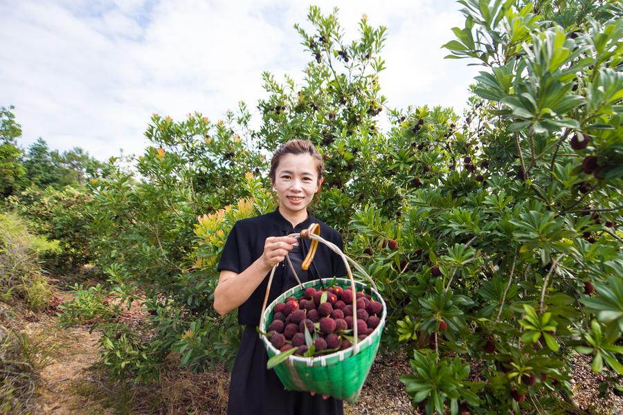 Agricultora mostra morangos chineses Dongkui recém-colhidos em um pomar no condado de Wencheng, província de Zhejiang, leste da China, no dia 23 de junho de 2025. (Xinhua/Jiang Han)
