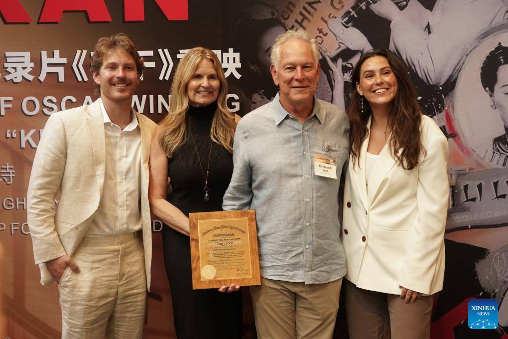 Mark Scott (segundo, à direita), filho de Rey Scott, correspondente do documentário "Kukan", antes da exibição de sua versão recém-restaurada no Museu da Academia de Cinema de Los Angeles, Estados Unidos, no dia 24 de junho de 2025. A versão recém-restaurada do documentário "Kukan" estreou na terça-feira. "Kukan", que significa "luta amarga" ou "trabalho duro" em chinês, é um documentário vencedor do Oscar produzido pelo dramaturgo sino-americano Li Ling-Ai e filmado pelo correspondente americano Rey Scott. (Foto por Zeng Hui/Xinhua)