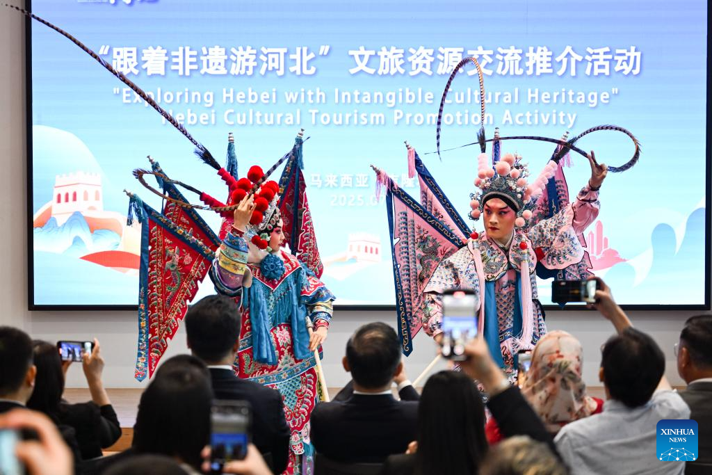 Artistas se apresentam no "Explorar Hebei com o Patrimônio Cultural Imaterial", um evento de promoção turística com a província de Hebei, no norte da China, em Kuala Lumpur, Malásia, no dia 7 de julho de 2025. Realizado na segunda-feira, o evento de promoção cultural e turística teve uma exposição de artesanato tradicional de Hebei, incluindo baixos-relevos complexos, recortes de papel e cerâmica, além de apresentação cultural com demonstração de ópera tradicional chinesa. (Xinhua/Cheng Yiheng)