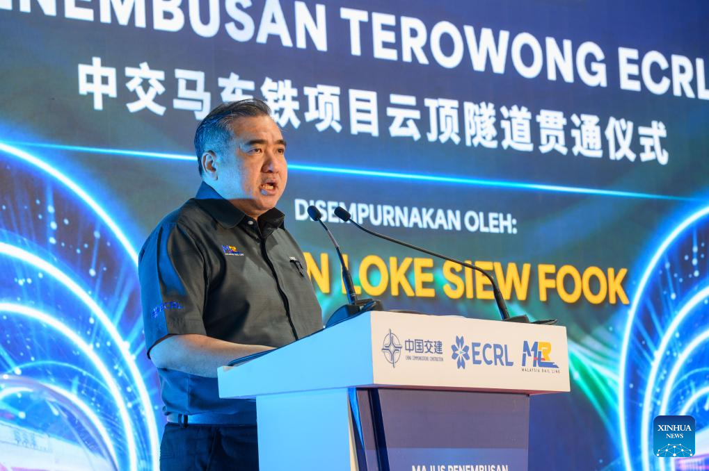 O ministro dos Transportes da Malásia, Anthony Loke Siew Fook, discursa na cerimônia comemorativa da construção do Túnel Genting, de 16,39 quilômetros, da Ligação Ferroviária da Costa Leste (ECRL, na sigla em inglês), no Estado de Pahang, Malásia, no dia 12 de julho de 2025. a Ligação Ferroviária da Costa Leste (ECRL, na sigla em inglês), um megaprojeto ferroviário na Malásia em construção pela China Communications Construction Company (CCCC), alcançou outro marco importante no sábado com a construção do Túnel Genting, de 16,39 quilômetros. O avanço é uma conquista significativa, situada abaixo de mais de 750 metros de terreno montanhoso, afirmou a empresa em comunicado após cerimônia para comemorar a ocasião. (Foto por Chong Voon Chung/Xinhua)