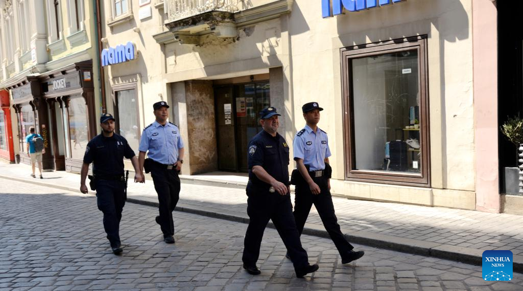 Policiais chineses e croatas são fotografados em patrulha conjunta em Zagreb, Croácia, em 31 de julho de 2025. (Xinhua/Li Xuejun)