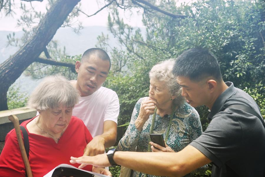 Elyn MacInnis (1ª à esquerda) olha um mapa antigo de Kuliang, agora um resort na encosta de uma montanha, em Fuzhou, província de Fujian, no sudeste da China, em 24 de junho de 2023. (Xinhua)