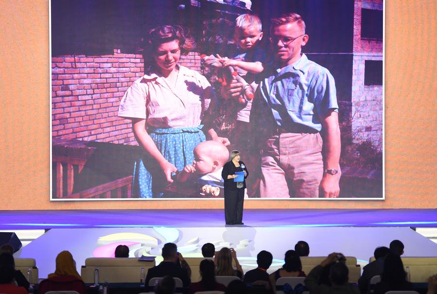 Elyn MacInnis discursa sobre o vínculo de sua família com Kuliang na 4º edição do Festival Internacional de Turismo da Rota da Seda Marítima (Fuzhou), em Fuzhou, província de Fujian, sudeste da China, em 30 de novembro de 2018. (Xinhua/Lin Shanchuan)