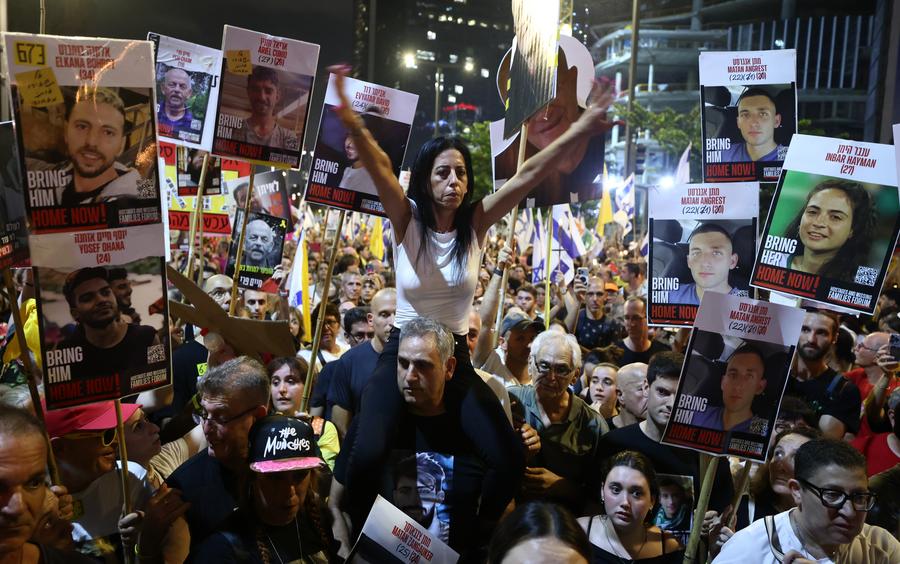 Povo israelense é fotografado durante protesto contra decisão do exército israelense de tomar a Cidade de Gaza em Tel Aviv, Israel, em 9 de agosto de 2025. A decisão do exército israelense de tomar a Cidade de Gaza foi condenada tanto nacional quanto internacionalmente, com críticos argumentando que ela viola o direito internacional, agrava a crise humanitária em Gaza e prejudica os esforços para alcançar um cessar-fogo. (Foto por Jamal Awad/Xinhua)