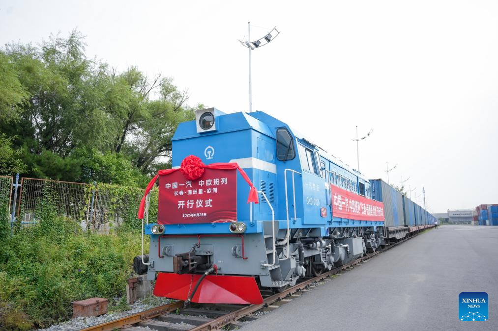 Changchun, 26 ago (Xinhua) -- Um trem carregado com autopeças de alta qualidade de uma das principais montadoras chinesas, a China FAW Group Co., Ltd., partiu de Changchun, na Província de Jilin, no nordeste da China, para a Europa nesta segunda-feira, marcando o primeiro serviço direto do Expresso Ferroviário China-Europa da empresa.