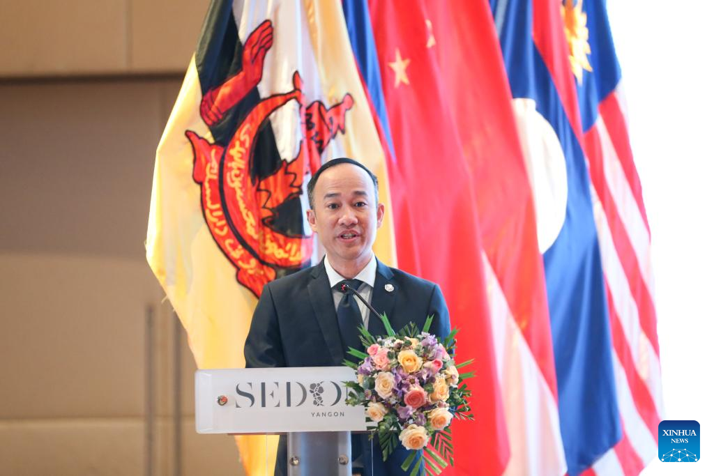 Ly Davuth, secretário-geral adjunto do Centro Integrado de Cooperação em Segurança e Aplicação da Lei Lancang-Mekong (LMLECC, na sigla em inglês), discursa no Fórum de Segurança e Proteção do Turismo entre a Associação das Nações do Sudeste Asiático (ASEAN) e a China, em Rangum, Mianmar, em 25 de agosto de 2025. O fórum foi organizado conjuntamente pelo ACC, pelo Ministério da Hotelaria e Turismo de Mianmar e pelo Centro Integrado de Cooperação em Segurança e Aplicação da Lei Lancang-Mekong (LMLECC, na sigla em inglês). O foco foi a construção de uma barreira de segurança sólida, o avanço do desenvolvimento e da prosperidade do turismo regional e a busca por medidas práticas para enfrentar os desafios. (Foto por Myo Kyaw Soe/Xinhua)