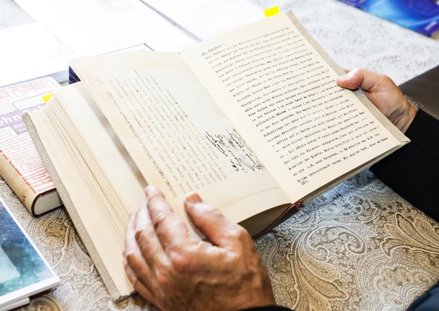 Thomas Rabe folheia diários de seu avô, John Rabe, no Centro de Comunicação John Rabe, em Heidelberg, Alemanha, em 7 de agosto de 2025. (Xinhua/Zhang Fan)