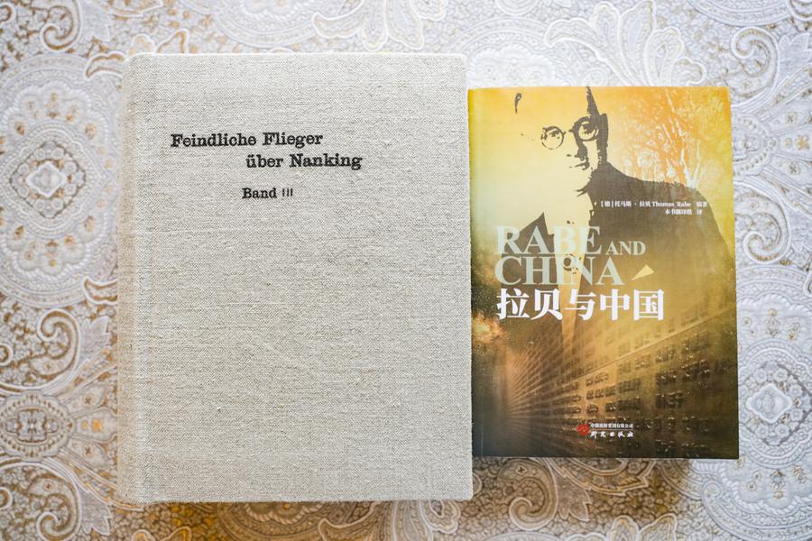 Foto tirada em 7 de agosto de 2025 mostra versão alemã dos diários de John Rabe e um livro sobre ele, "Rabe e a China", no Centro de Comunicação John Rabe em Heidelberg, Alemanha. (Xinhua/Zhang Fan)